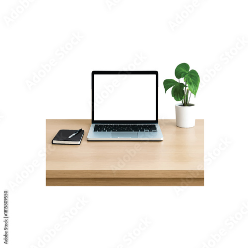 © Sumit, Fototapeta premium Print Minimalist workspace with a laptop, notebook, and plant