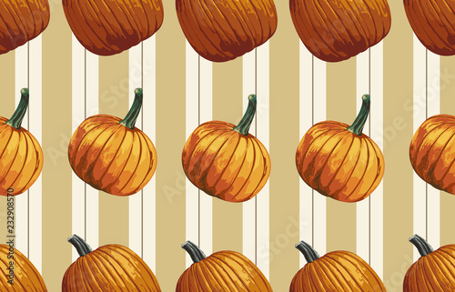 © Karmina, Fototapeta premium Printable seamless vintage autumn repeat pattern background with pumpkins. Botanical wallpaper, raster illustration in super High resolution.