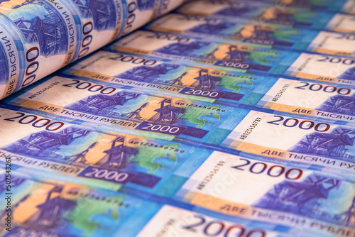 Fototapeta premium Printing and cutting banknotes. Russian money.