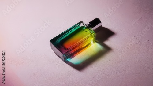 © Safina, Naklejka premium Prismatic refraction: A square perfume bottle casts a spectrum of light on pink