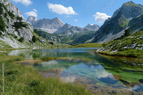 Naklejka premium Pristine alpine lake is reflecting the blue sky and the rocky peaks of the surrounding mountains on a beautiful summer day