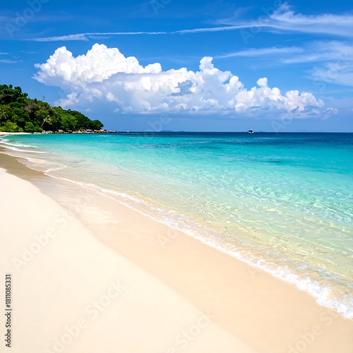 © asu, Fototapeta premium Pristine beach scene featuring white sand, clear turquoise water, a vibrant blue sky with fluffy white clouds, and lush green vegetation