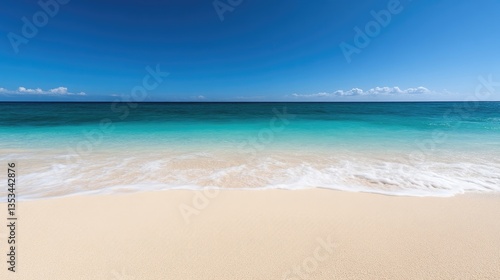 Fototapeta premium Pristine beach scene with turquoise ocean and a clear blue sky. Soft waves...