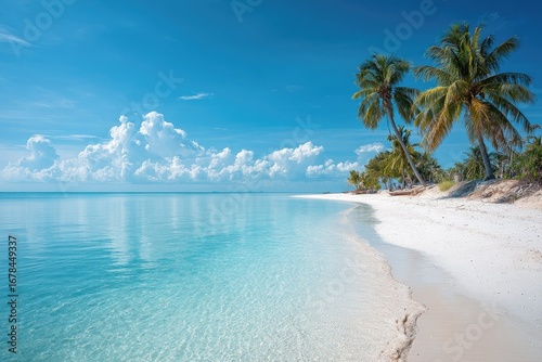 Fototapeta premium Pristine beach, turquoise water, palm trees, bright sky