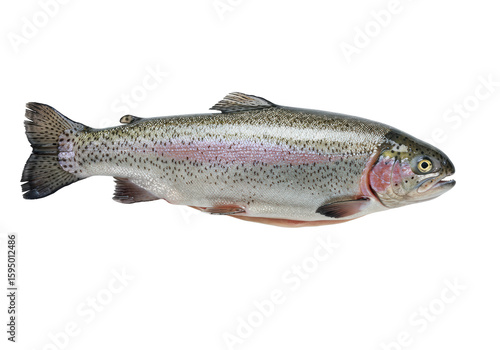 © Noah, Naklejka premium Pristine fresh rainbow trout with glistening silvery scales, iridescent dark spots, dark head, and clearly visible fins, isolated against a transparent studio background, Concept for gourmet food