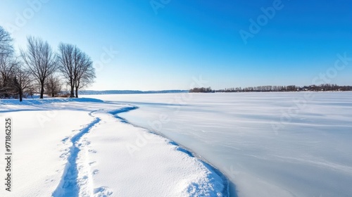 Fototapeta premium Pristine Frozen Lake Landscape with Snow Covered Trees in Winter Wonderland