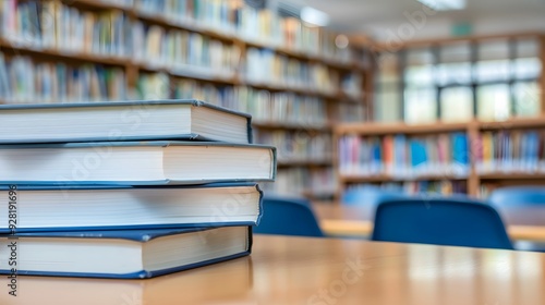 Fototapeta premium Pristine Textbook Stack on Library Table, Embodiment of Untapped Knowledge...