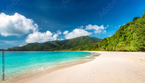© Orion, Fototapeta premium Pristine Tropical Beach With White Sand Calm Turquoise Water And Lush Green Mountains In Background