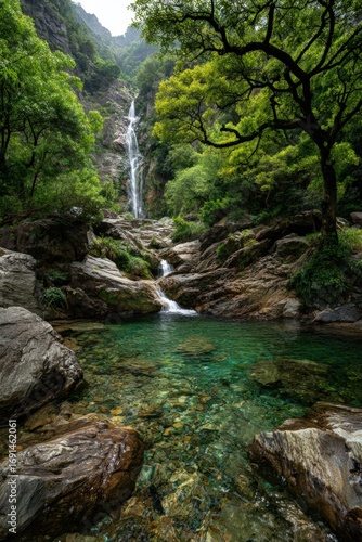 © Wawan, Fototapeta premium Pristine waterfall cascading into a tranquil pool, surrounded by lush greenery