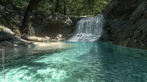 © arda, Fototapeta premium Pristine waterfall cascading into turquoise pool, forest backdrop. Possible use nature, travel, serenity