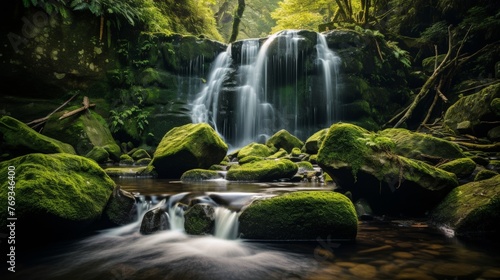 Fototapeta premium Pristine waterfall with moss covered rocks and greenery