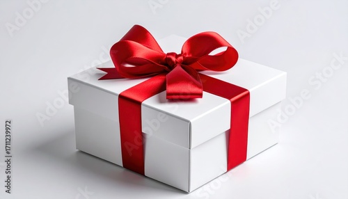 © CleanSlate, Obraz premium Pristine white gift box tied with a vibrant red satin bow, casting soft shadows against a seamless background, evokes celebration