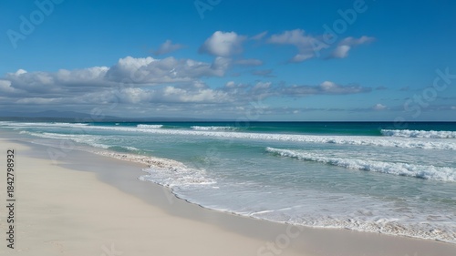 Fototapeta premium Pristine white sand beach meets turquoise ocean waves under a bright blue sky with scattered white clouds in the distance