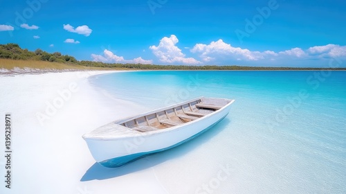 Naklejka premium Pristine white sand beach meets turquoise water, perfect for a peaceful boat ride. Tranquil lake scene, ideal for relaxation