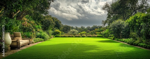 © artist, Naklejka premium Private garden photography in high dynamic range, featuring green lawn and ivory accents on a cloudy day.