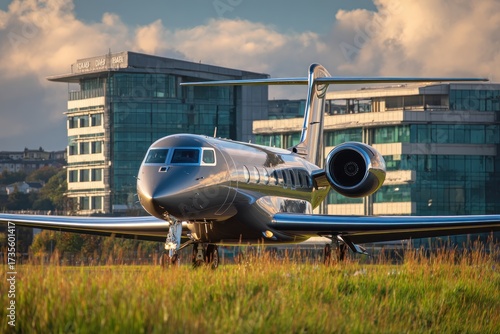 © teostudio, Naklejka premium Private Jet Aircraft on Tarmac with Modern Buildings in Background.