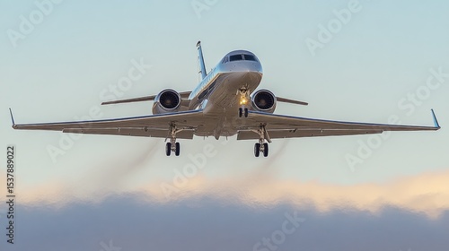 Fototapeta premium Private jet landing, clouds below, airport runway