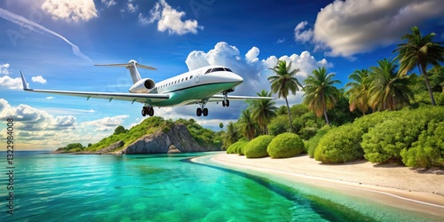 Fototapeta premium Private Jet Landing Exotic Island Paradise: Luxury Travel, Private Aviation, Jet Charter, Scenic Flight