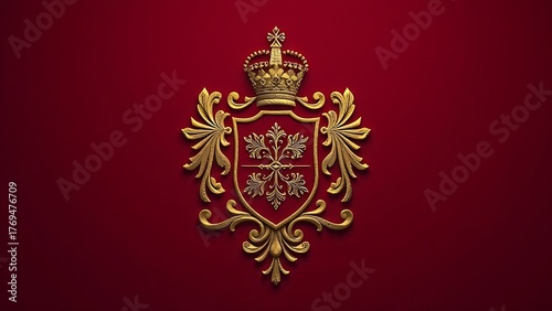 © Vanessa, Naklejka premium privilege. An intricate gold-embossed heraldic crest on a deep crimson background. event programs, museum guides, designed for cultural heritage projects and event programs.