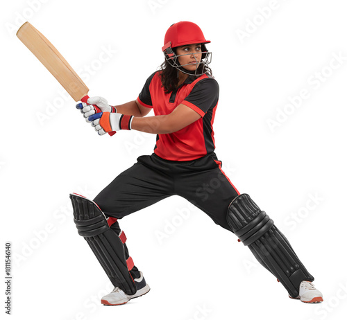Naklejka premium Pro female cricketer in red and black uniform in ready position, isolated...