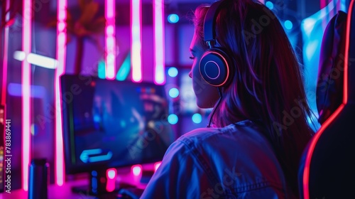 Obraz premium pro gamer man in headphones live streaming while playing online computer game, neon lights, esports, gaming, monitor, play, young, player, internet, enjoyment, cyber,.