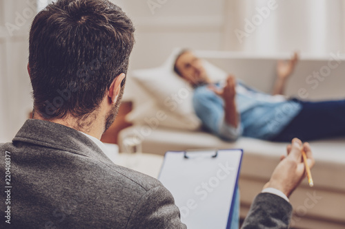 © Viacheslav Yakobchuk, Obraz premium Problem discussion. Professional psychologist looking at his visitor while solving family problems