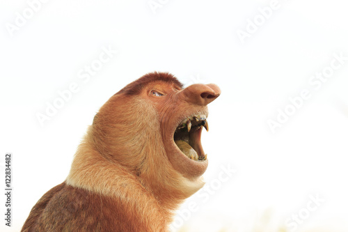 Fototapeta premium Proboscis Monkey. Big teeth and mouth. Monkey isolated white background