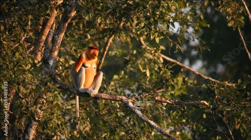 © Anat art, Fototapeta premium Proboscis Monkey Sits on Tree Branch Near River During Evening Light With Clear Upper Margin