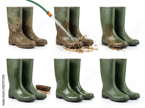 Fototapeta premium Process of cleaning muddy green rubber boots with a hose and brush on a white background.