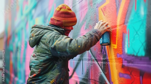 Fototapeta premium Process of creating graffiti, street artist with aerosol spray paint painting colorful stencil murals on the city walls,