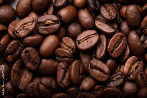 © Larysa, Fototapeta premium Processed collage of dark brown coffee beans texture. Background for banner, backdrop or texture