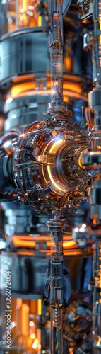 Fototapeta premium Produce a digital CG 3D rendering of a high-tech fuel cell from a dynamic frontal angle, showcasing glossy surfaces and intricate mechanisms that mesmerize the audience