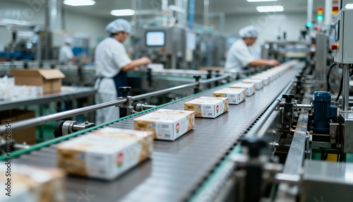 Obraz premium Production Line Conveyor Belt with Packaged Goods in a Modern Manufacturing Facility, Showing Automation