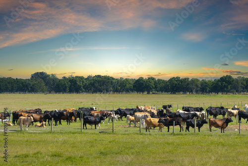 © bilanol, Obraz premium Production of organic dairy products. Milk cows grazing on green farm pasture. Feeding of cattle on farmland grassland