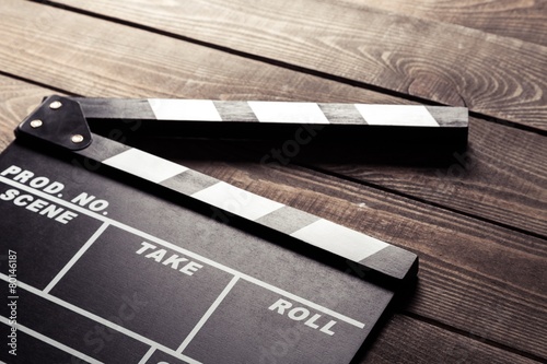 © BillionPhotos.com, Naklejka premium Production. vintage photo of movie clapper on wood