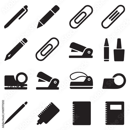 © Mfair, Obraz premium Productivity essentials icon set black office tools