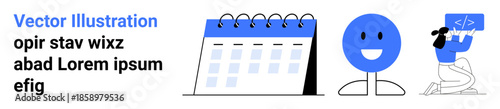 Fototapeta premium Productivity tools, time management, digital communication, planning tasks, user interface, creativity. A calendar, happy face and person holding a tablet. Productivity tools and time management