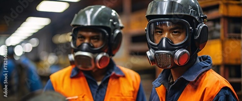 © Monmeo, Naklejka premium professional a gas mask engineer factory in protective uniform operating machine, Engineering worker in safety hardhat at warehouse industrial facilities, Heavy Industry Manufacturing