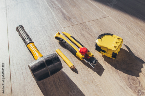 © andrey gonchar, Fototapeta premium Professional and qualified laminate flooring - floating floor