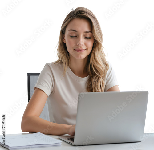 © Zalpix, Naklejka premium Professional at Work – Person Using Laptop with Papers on Desk for Business and Office Scenes
