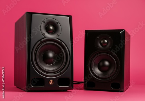© Running opossum, Fototapeta premium Professional audio equipment for sound recording and mixing featuring two black studio monitors on a vibrant pink backdrop