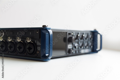 Obraz premium Professional audio recorder with connectors and knobs. Selective focus