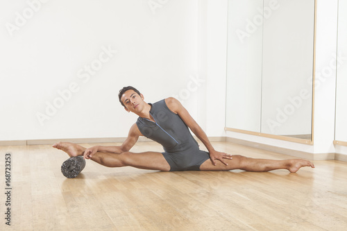 © Tommaso Lizzul, Obraz premium professional ballet dancer stretching and warming up using foam roller