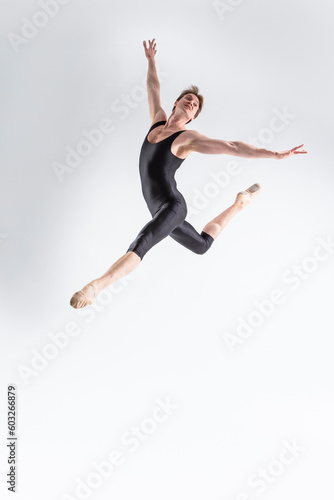 © danmorgan12, Obraz premium Professional Ballet Dancer Young Caucasian Athletic Man in Black Suit Dancing in Studio On White Background With Lifted Hands.