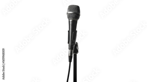 © Abdul, Obraz premium Professional black microphone on stand for singing and recording studio audio equipment isolated on white on transparent background