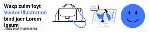 Fototapeta premium Professional briefcase, graphical analysis on a computer screen, man presenting data, blue happy face. Ideal for business presentations, tech blogs, educational infographics, training materials