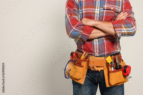 © New Africa, Fototapeta premium Professional builder with tool belt on light background, closeup. Space for text