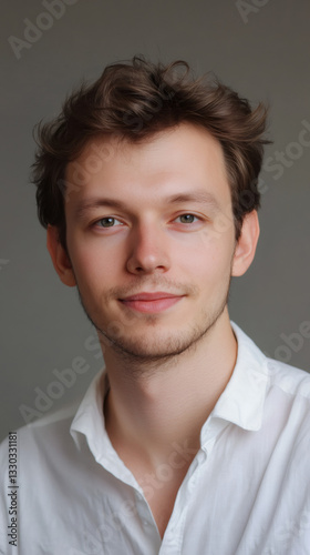 © Michael, Fototapeta premium Professional businesswoman with brown hair standing confidently in office setting
