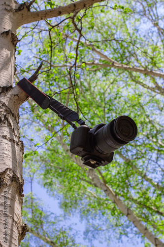 © Torkhov, Fototapeta premium professional camera left on a birch branch against a blue sky with a blurred background