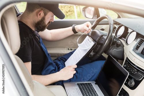 © xartproduction, Obraz premium Professional car mechanic working in auto repair service. Computer video investigate. Engine diagnostics. Service station.